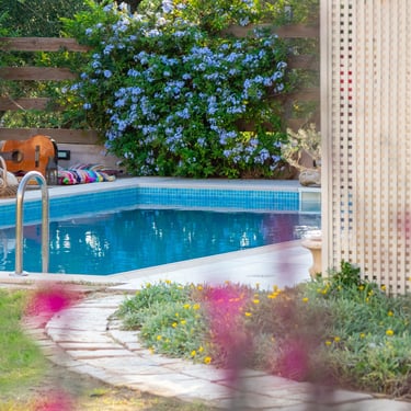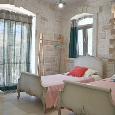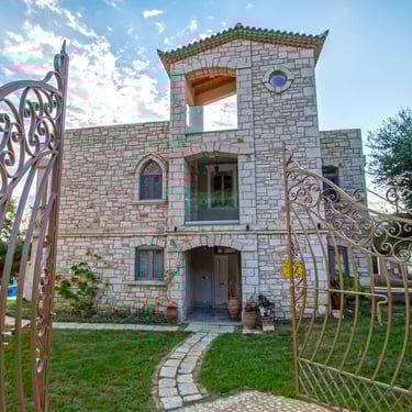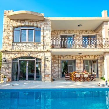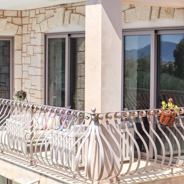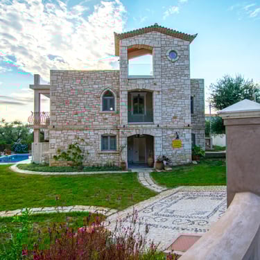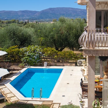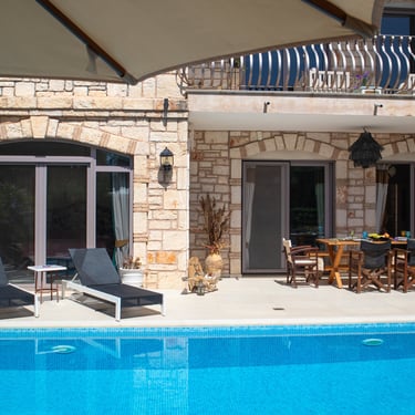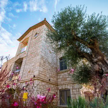 In the land of olives, built of local stone, Villa Olga's exterior combines timeless architecture with nature.
